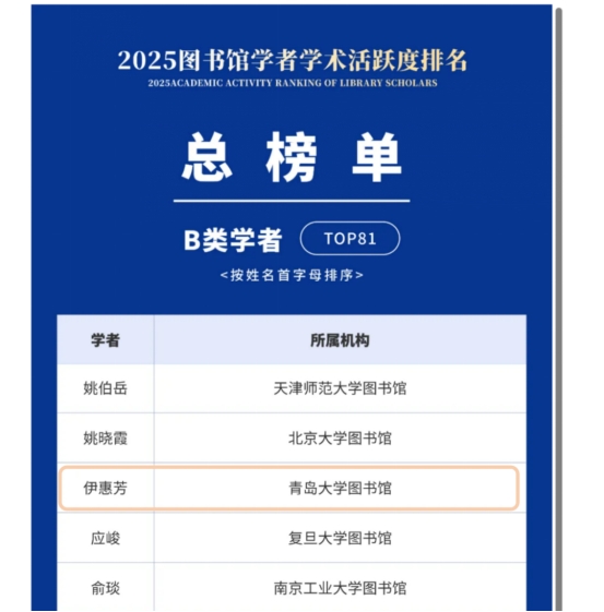 我校图书馆馆员伊惠芳博士凭借丰硕的学术成果和活跃的研究表现入选“2025最具学术活跃度图书馆学者”B类榜单,这是图书馆首次有馆员入选“图书馆学者学术活跃度”排名。